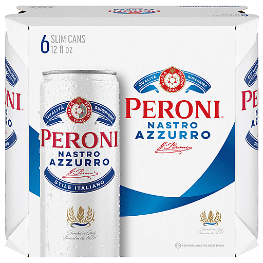 Enjoy Peroni Nastro Azzurro, a refined beer with a distinctive crisp and refreshing taste. Peroni's exceptionally dry, medium-bodied pale lager features citrus, rye toast and delicate spice notes with 5% ABV. Deliciously effervescent, this inspiring adult beverage is the top premium Italian beer brand in the world. It makes the perfect accompaniment to the flavorful foods of the Mediterranean and beyond. Pairs well with appetizers and Italian cuisine and can be enjoyed at a cocktail bar, on the rooftop or anytime you want to celebrate life with passion and flair. Get a 6 pack of 12 fl oz cans and live every moment with Peroni Nastro Azzurro.