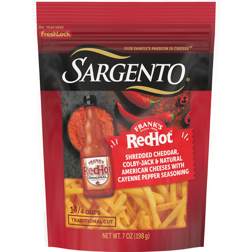 Sargento® brand joined forces with Frank's RedHot® brand to create a distinctive mix of real, natural cheese and bold, zesty spice. Kick things up a notch with Frank’s RedHot® Original- a premium blend of aged Cayenne peppers, vinegar, salt, and garlic- paired with the creamy, mild flavor of cheddar, Colby-jack, and Sargento® Natural American cheeses. Sargento® Cheddar, Colby-Jack & American Shredded Cheeses with Cayenne Pepper Seasoning 7 oz. package of traditional cut shredded cheese melts effortlessly, making it perfect for Buffalo chicken nachos, a cheesy potato casserole, classic mac n' cheese, or any cheesy dish that could use a hint of heat. For three generations, the Sargento family has proudly crafted high-quality, natural cheese you can trust. Frank’s RedHot® is a registered trademark of The French’s Food Company, LLC, licensed to Sargento Foods Inc.